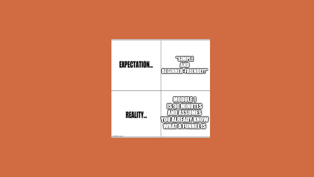 Expectation: Simple and beginner-friendly. Reality: Module 1 is 90 minutes and assumes you already know what a funnel is.